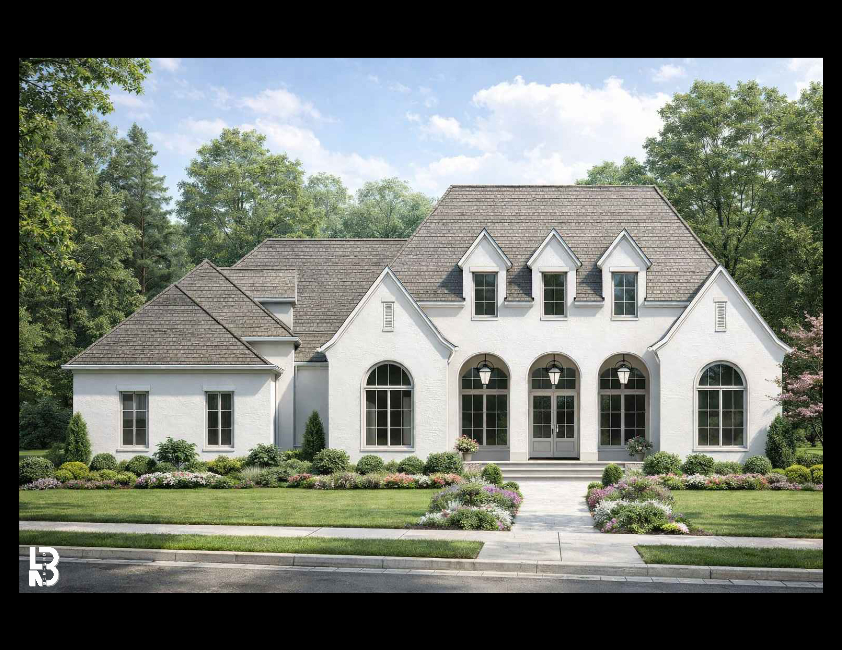 • Classic European-inspired exterior with steep gables and arched architectural details