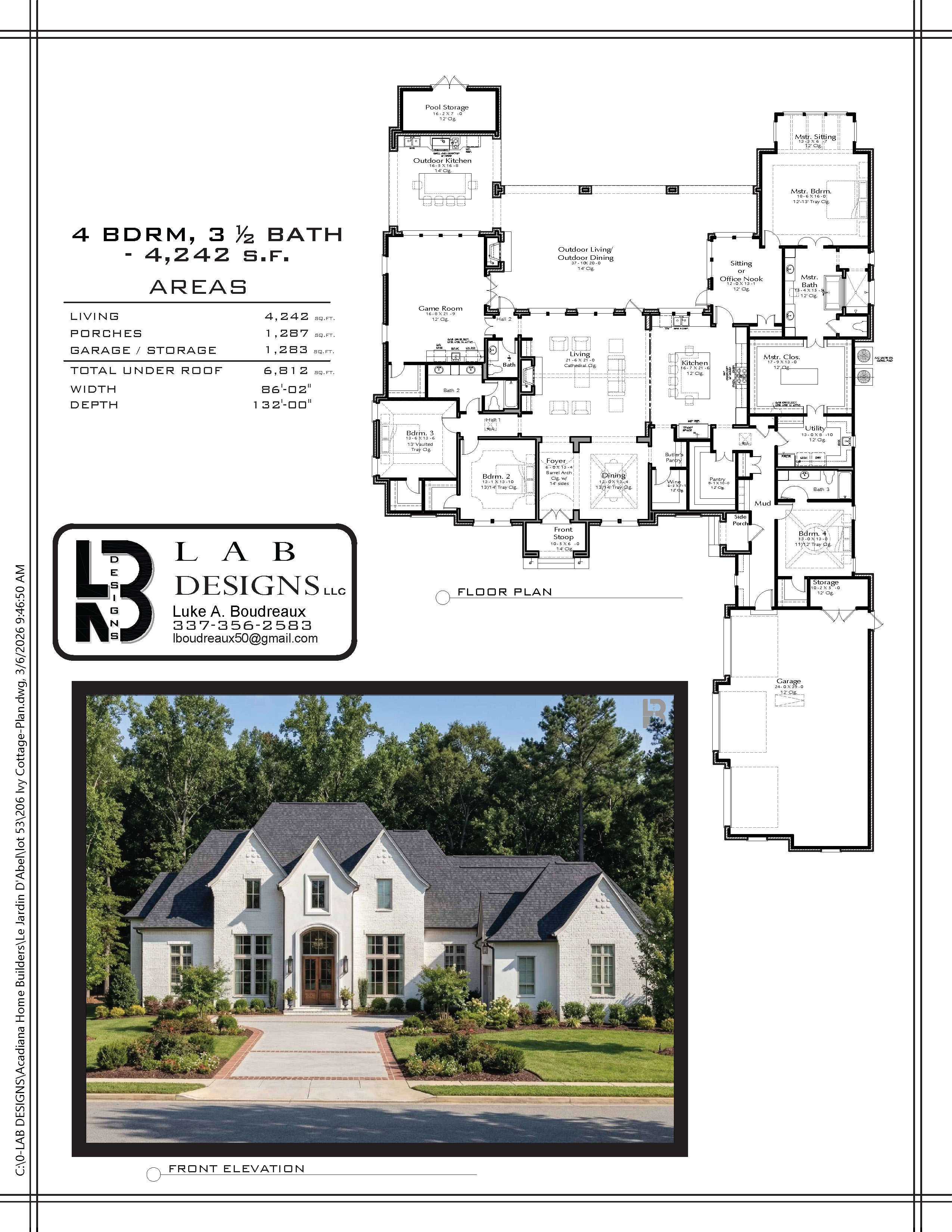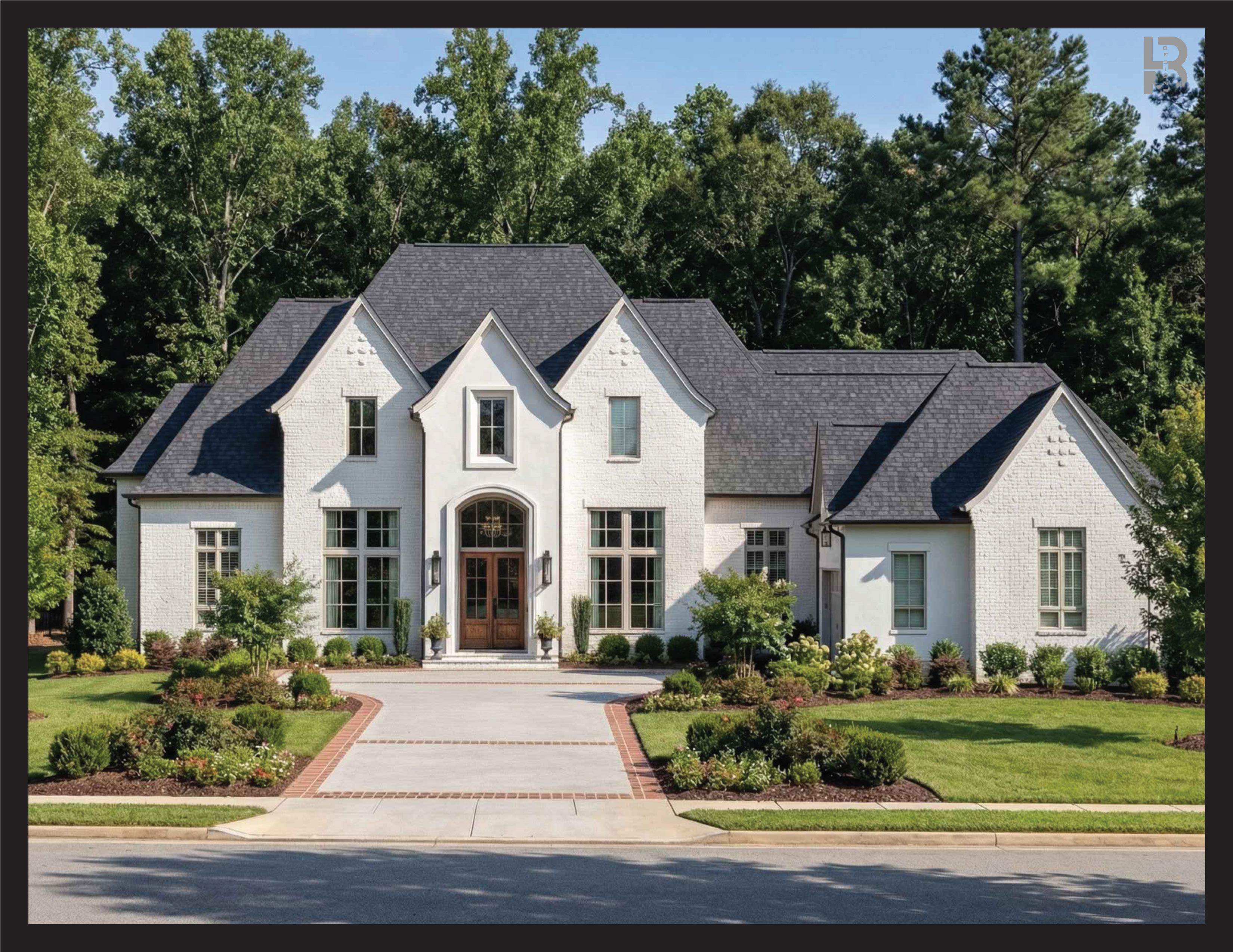 • Traditional European-inspired exterior with painted brick and steep gabled rooflines